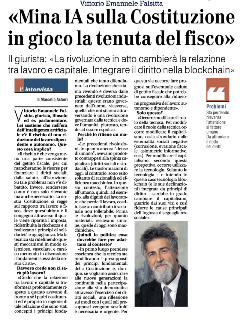 Falsitta analizza i rischi che la rivoluzione dell'intelligenza artificiale pone ai fondamenti costituzionali italiani: la progressiva riduzione del lavoro dipendente e autonomo, l'impatto sul gettito fiscale e sui diritti sociali, e la necessità di integrare il diritto nella blockchain per correggere le distorsioni del capitalismo e ridurre le diseguaglianze sociali.